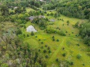 This custom built home is set on a 20 acre wooded lot. Featuring 2,992 sq. ft. of living space. The natural landscaping has a 70 ft.x 100 ft. spring fed pond with the Niagara Escarpment wall flanking the custom built waterfall. If you love nature or an avid deer hunter, this property offers view of birds and wildlife from the home and the deer stands. The home includes 3 bedrooms, 2.5 bath rooms and a finished lower level. Built in 2002, this home has timeless finishes and design. Also includes a Grain Bin Gazebo. Ready for your outdoor cookouts. Inside is a lap pool for your everyday exercise. There is so much to see and experience at this beautiful property.